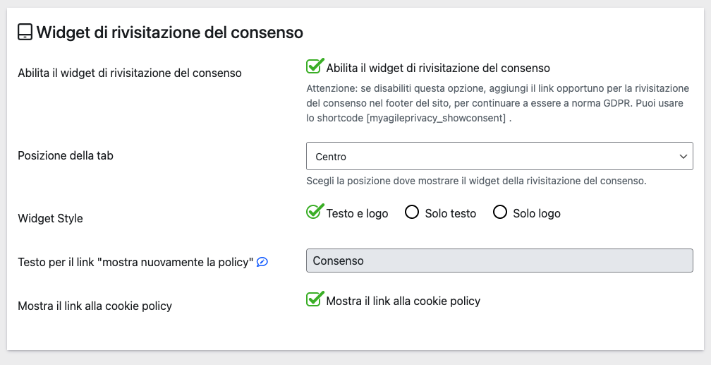 Gli utenti devono poter rivedere le scelte in qualsiasi momento. Configura il widget dalla tab dedicata; se lo nascondi, aggiungi link/button visibile (es. nel footer) che permetta di riaprire le preferenze. Le istruzioni sono nella tab.